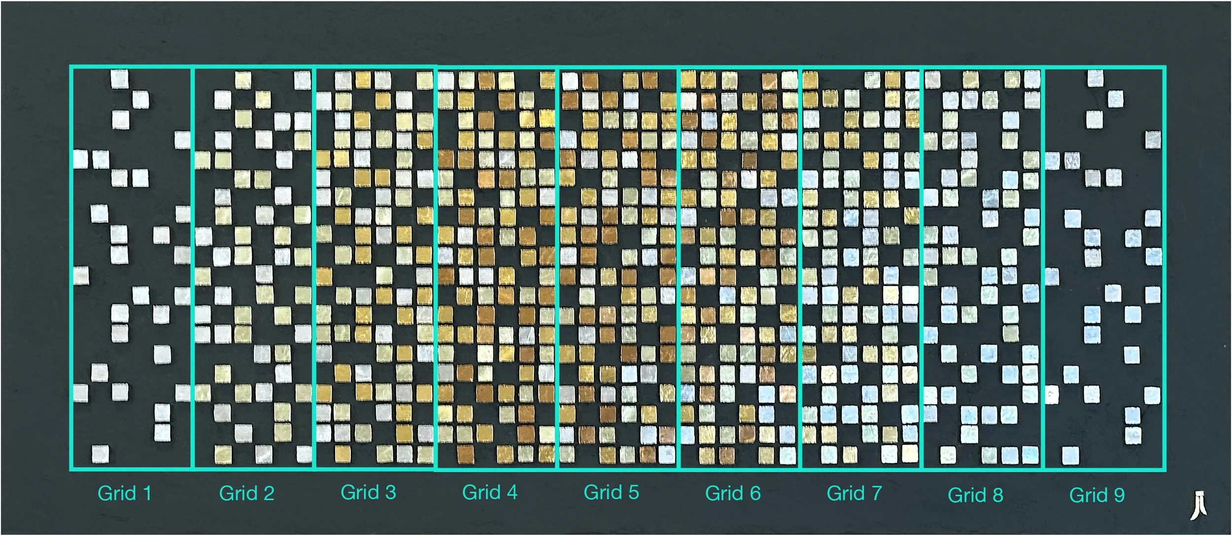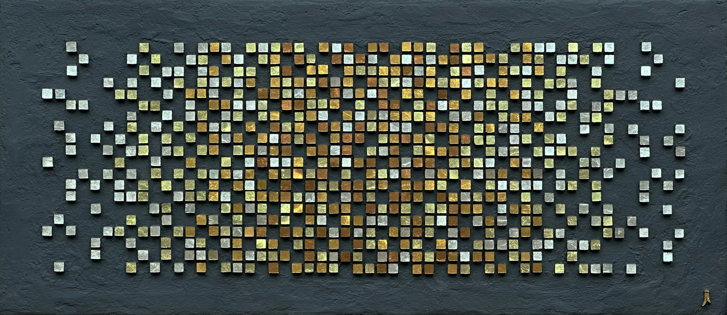 Fugue in Four Voices (2025) 11” x 27” | 28cm x 69cm. Mosaic gold (Orsoni 002 006, 010, 014), charcoal cement