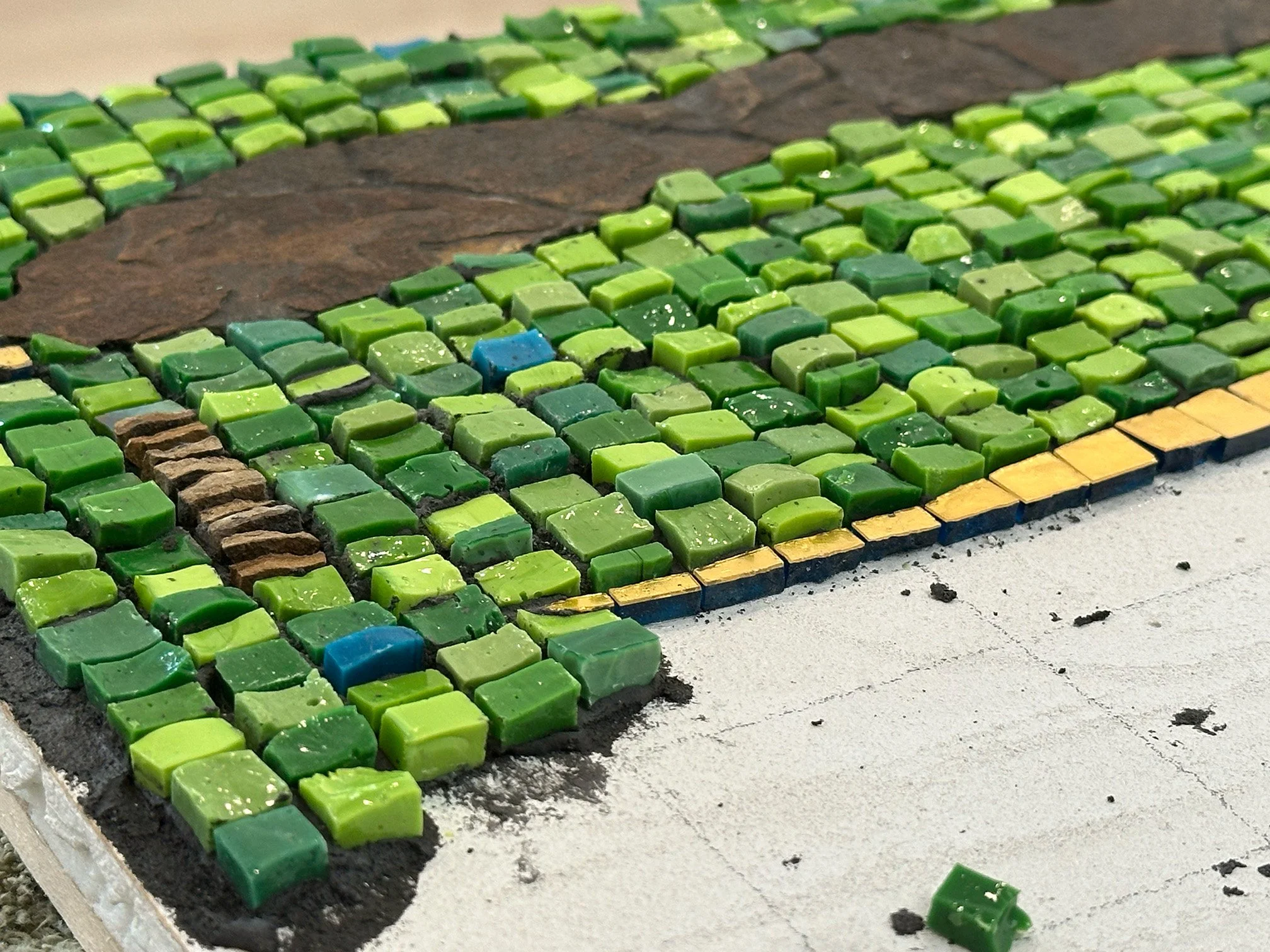The Sound of Green, in progress 20” x 30”. Shale, smalti, mosaic gold
